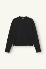 • Cropped silhouette with distressed collar, cuffs, and hem