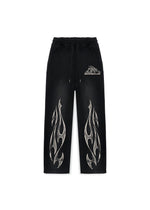 GM logo sweatpants washed black, made from 100% cotton. Wide leg straight sweatpants crafted from 100% cotton 480gsm. Elasticated waistband with drawstring, It has two hip pockets and is finished with GM graphic logo and flames to match.